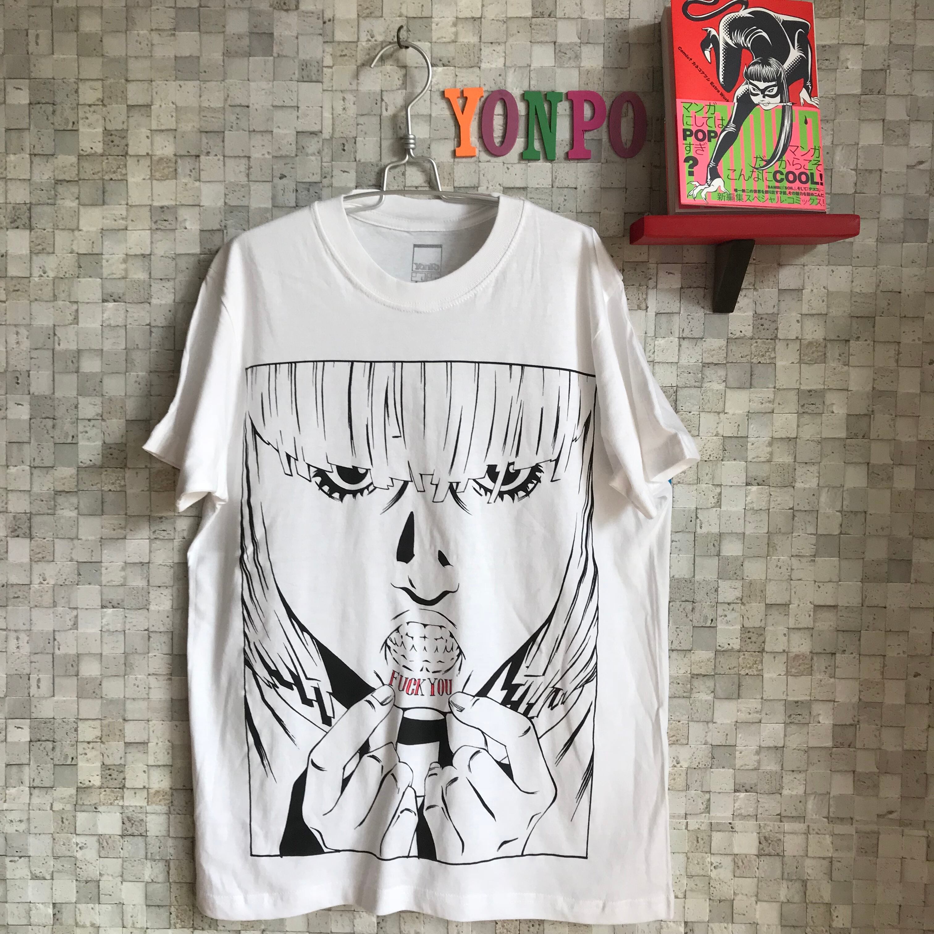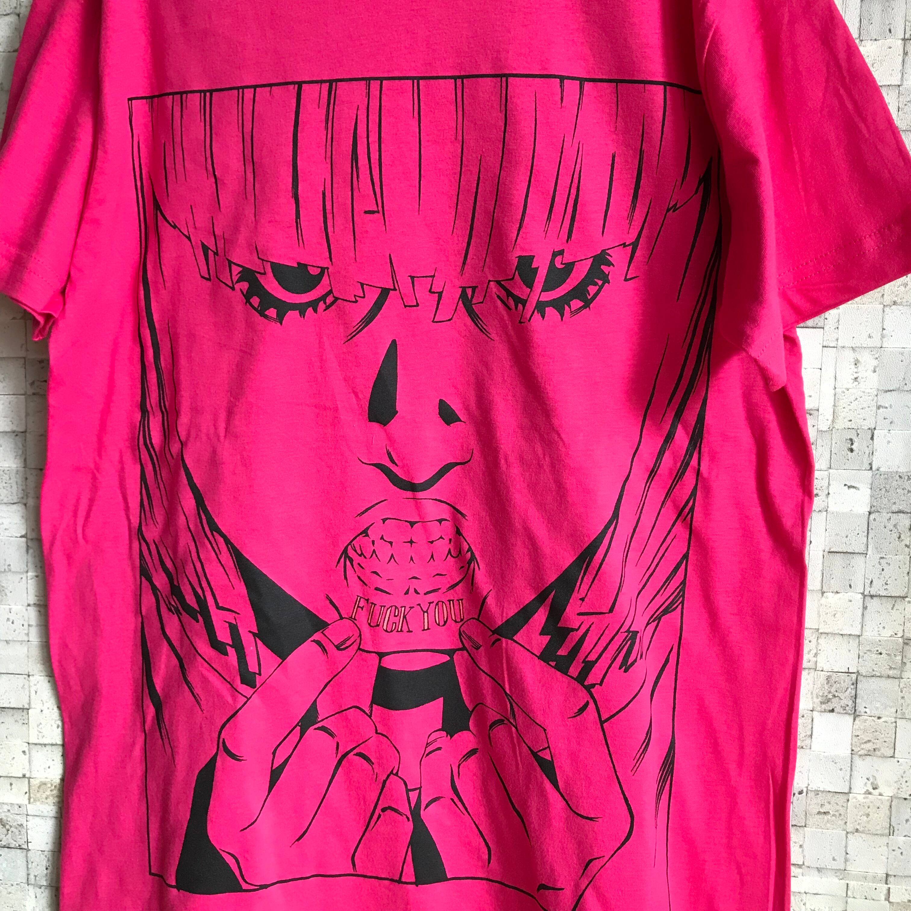 唇のFUCK YOUの文字は蛍光レッドで印象的に。